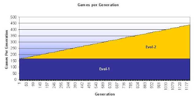 - It is not reproducible. If the best individual is determined in a generation chances are very high a different individual would be selected if the calculation would be repeated. This is caused by the high degree of randomness involved when playing small amount of games.